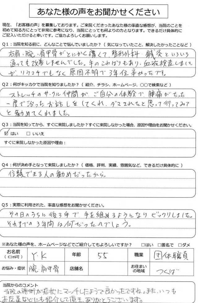 右肩、腕、肩甲骨がとにかく痛くて、整形外科、鍼灸といろいろ通っても改善しませんでした。
